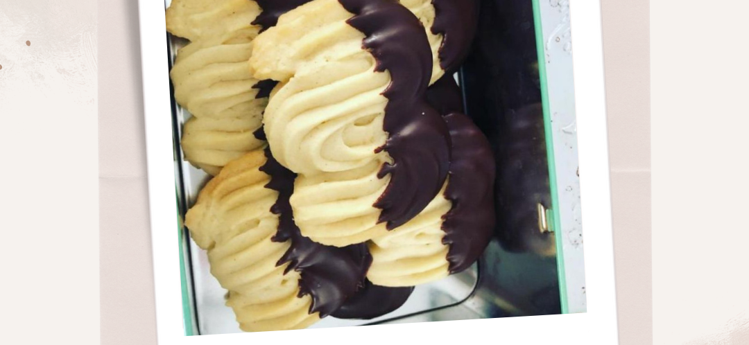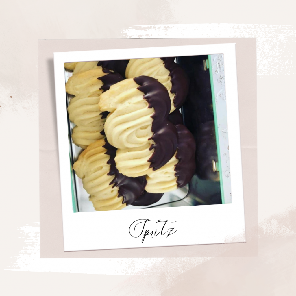 Spritz Biscuit sablé Chocolat noir, au lait, ou dulcey Noisettes concassées, amande, ou noix de coco Prix à la douzaine : 15 euros