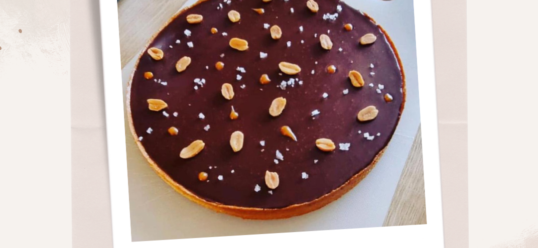 Tarte Snickers Pâte sucrée noisette ou cacao Cacahuètes torréfiées Caramel beurre salé Ganache chocolat au lait Prix 3/4 personnes : 20 eurosPrix 6/8 personnes : 25 euros