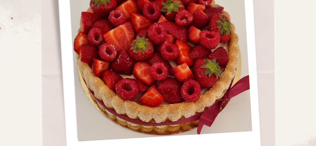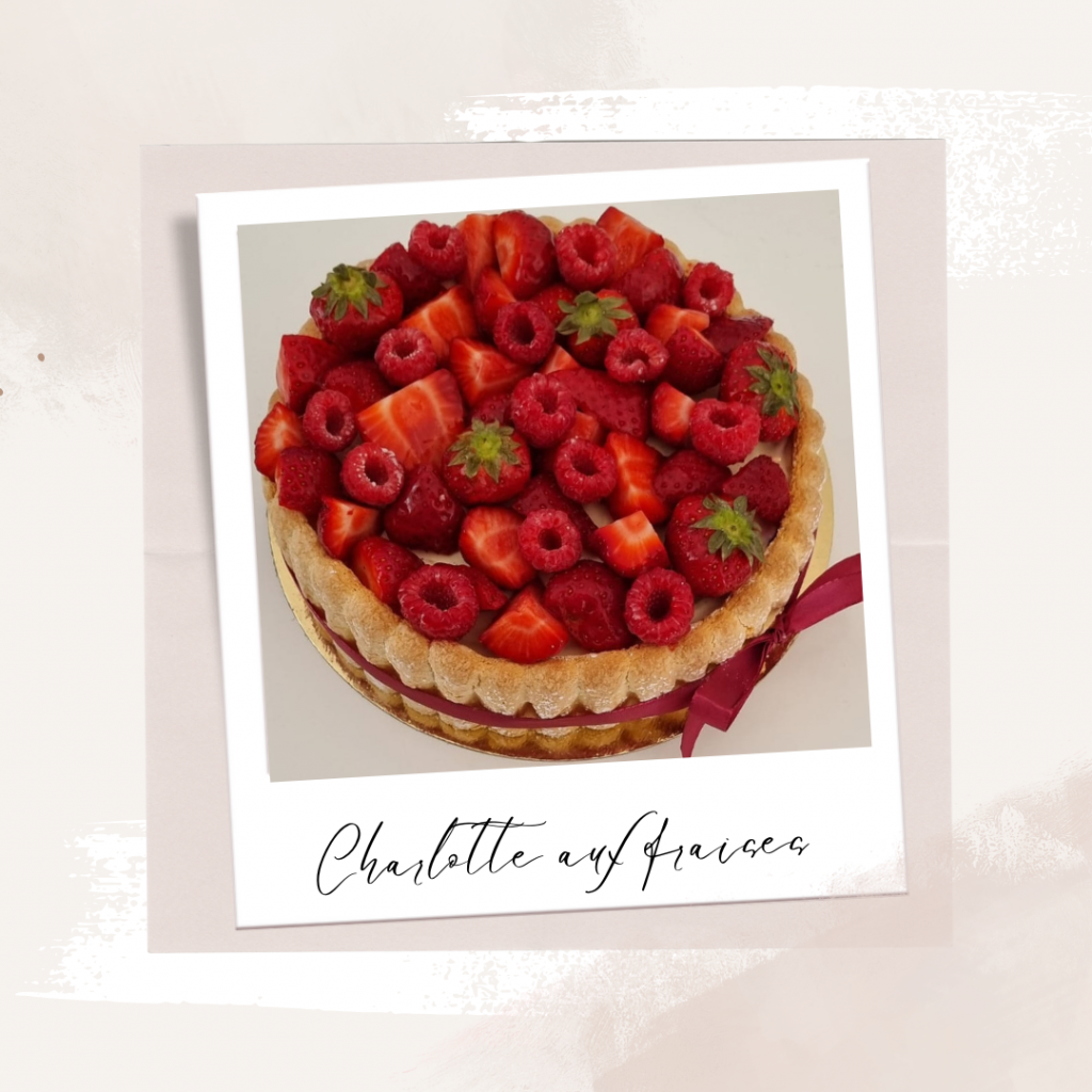 Charlotte aux fraises Saison : Avril à Juin Biscuits cuillère Bavaroise à la vanille Fraises fraîches Prix 3/4 personnes : 20 eurosPrix 6/8 personnes : 25 euros