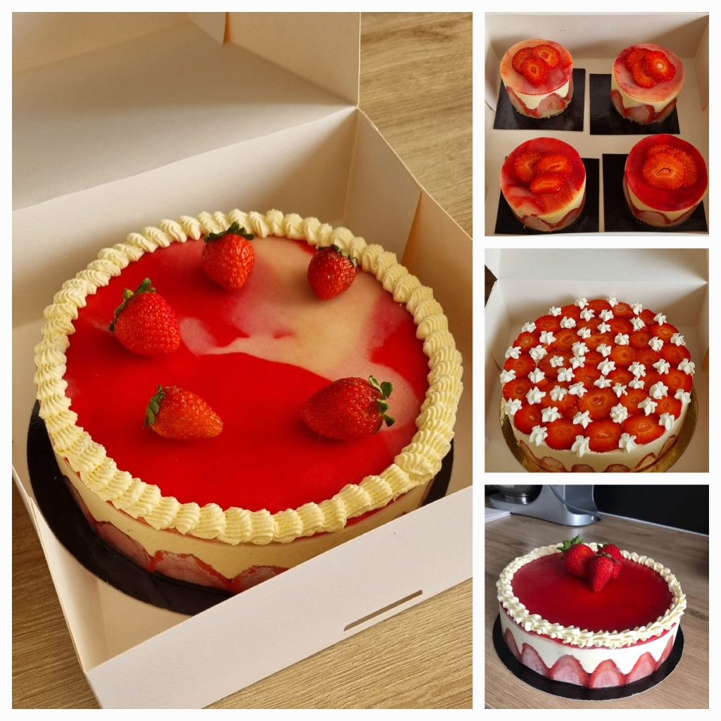 Fraisier Saison : Avril à Juin Base génoise nature Crème mousseline à la vanille Fraises fraîches Chantilly ou pâte d'amandes Prix individuel : 4 eurosPrix 3/4 personnes : 15 eurosPrix 6/8 personnes : 27 euros