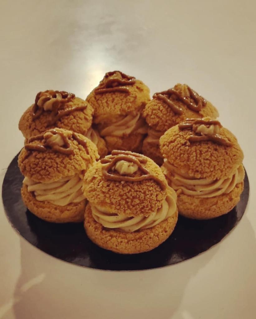 Paris Brest Pâte à choux Ganache montée pralinée Praliné pur Noisettes torréfiées Craquelin possible Prix individuel : 4 eurosPrix 3/4 personnes : 15 eurosPrix 6/8 personnes : 27 euros