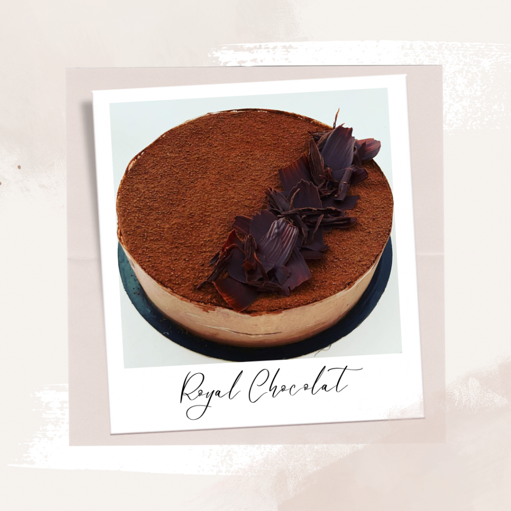 Royal Chocolat Biscuit dacquoise aux noisettes Praliné feuilleté Mousse au chocolat légère Cacao en poudre et feuilles chocolat Prix 3/4 personnes : 20 eurosPrix 6/8 personnes : 25 euros